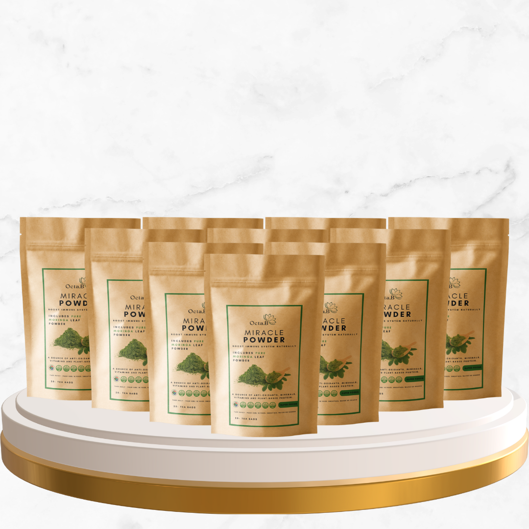 Our OB miracle powder is known as the tree of life. A dark green powder derived from the dried leaves of the moringa oleifera which is considered to be rich in protein, vitamin b6, vitamin c, riboflavin and various antioxidants, including quercetin and chlorogenic acid. An easy and convenient way to add a broad range of essential nutrients and vitamins into one’s diet and being from a food-based source easier to assimilate. Beneficial for anyone looking for a nutritive boost. Can be consumed as a supplement by adding it to drinks, smoothies, or food. The powder has a mild peppery flavor and is used to boost the nutritional content of a diet.